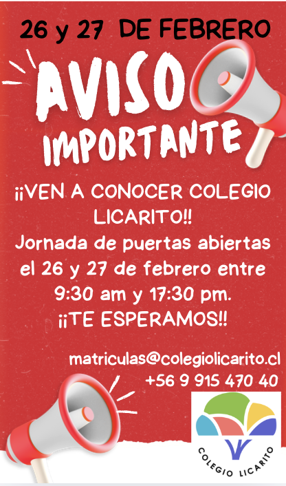 Visita SÓLO de alumnos/as nuevos/as para dar a conocer Proyecto Educativo Licarito y conocer las dependencias del colegio. En paralelo los apoderados/as se reúnen con Encargado de Convivencia Escolar. Horario de 9:00 a 10:00 hrs.